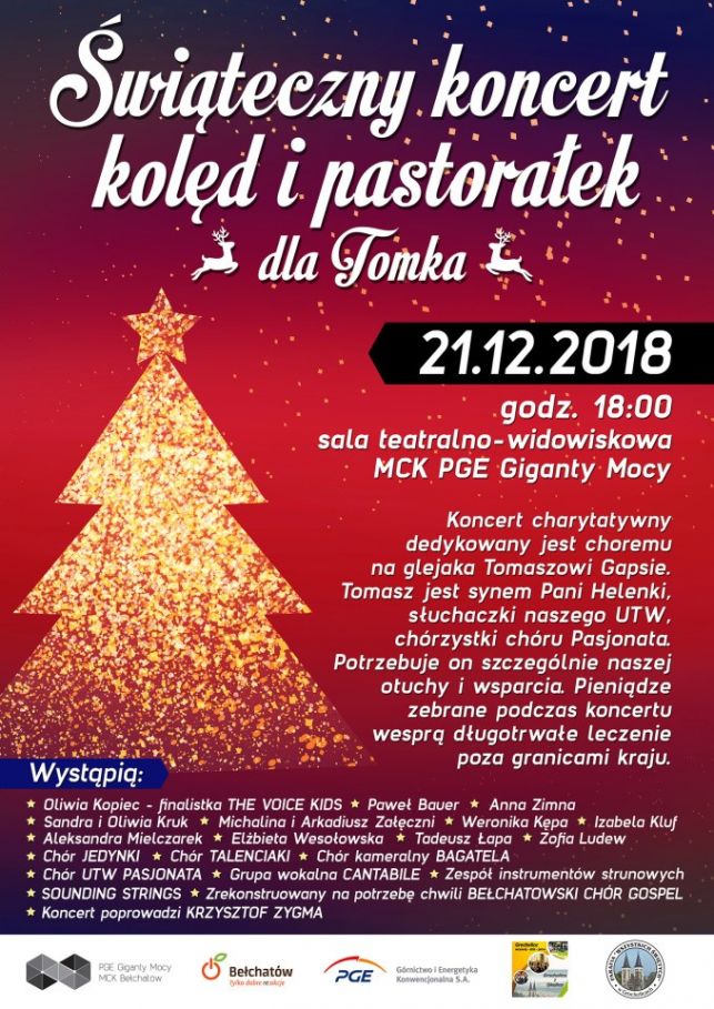 Aby wyrównać te szanse, potrzebujemy pomocy, którą będzie można okazać podczas świątecznego koncertu. Na scenie MCK PGE Gigantów Mocy wystąpią bełchatowscy wykonawcy – soliści, zespoły oraz chóry a swój występ zapowiedziała również Oliwia Kopiec – finalistka programu The Voice of Kids.