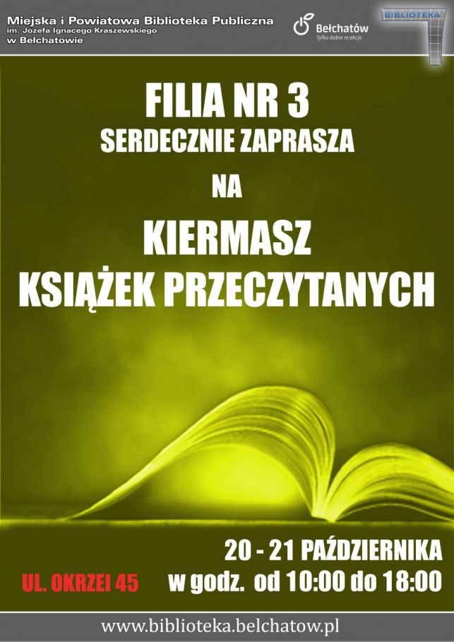 Kultura i edukacja Biblioteka Główna w Bełchatowie serdecznie zaprasza wszystkich miłośników książki na ''Kiermasz Książek Przeczytanych'', który odbędzie się w Filii nr 3 przy ul. Okrzei w dniach 20 - 21 października w godz. 10-18.