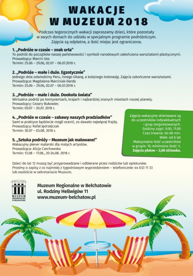 W Muzeum Regionalnym w Bełchatowie w nadchodzące wakacje rusza dla dzieci specjalny program podróżniczy. Podczas zajęć realizowane będzie pięć bloków wirtualnej podróży o zróżnicowanej tematyce, poczynając od historii naszego kraju, aż po plenerowe warsztaty malarskie.