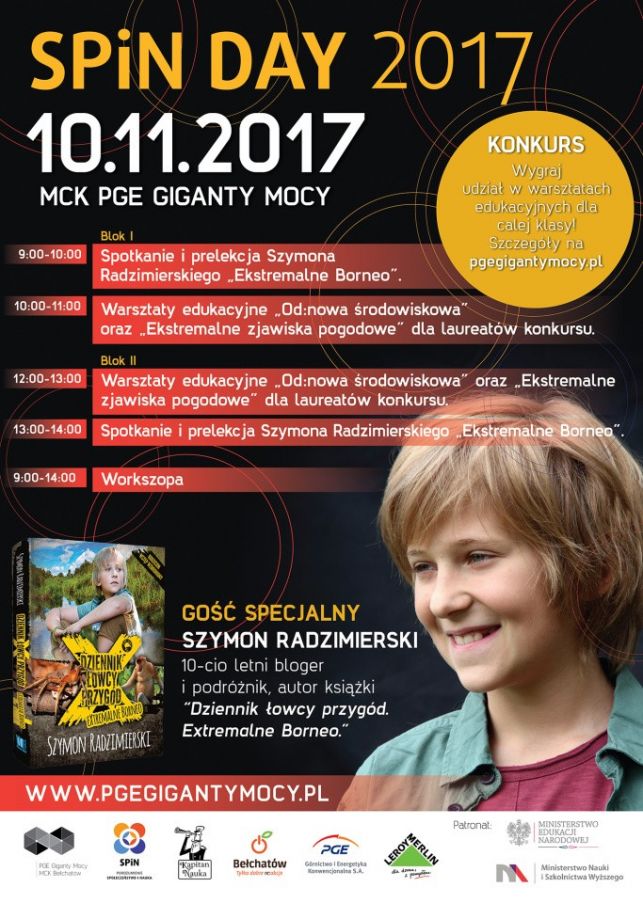 W tym roku, święto placówek naukowo – edukacyjnych będzie obchodzone w ramach akcji „Spin Day”, której celem jest ukazanie fascynującego oblicza nauki oraz inspirowanie do eksperymentowania. Podczas tegorocznej edycji, w MCK PGE Gigantach Mocy gościć będzie Szymon Radzimierski – dziesięcioletni podróżnik, autor książki „Dziennik łowcy przygód. Extremalne Borneo”, który opowie o swoich ekstremalnych podróżach.