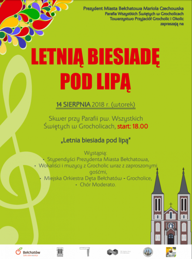 Hasłem przewodnim "Letniej Biesiady pod Lipą" są piosenki biesiadne. Uczestnicy wydarzenia będą mogli wspólnie śpiewać znane, polskie piosenki w miłej atmosferze. Na pikniku wystąpią m.in. stypendyści prezydenta Miasta Bełchatowa, wokaliści i muzycy z Grocholic, Miejska Orkiestra Dęta Bełchatów - Grocholice oraz chór Moderato. Dodatkową atrakcją będzie koncert zespołu Cover. Najmłodszym natomiast, zabawę zorganizuje aktywna grupa Przedszkoliada.