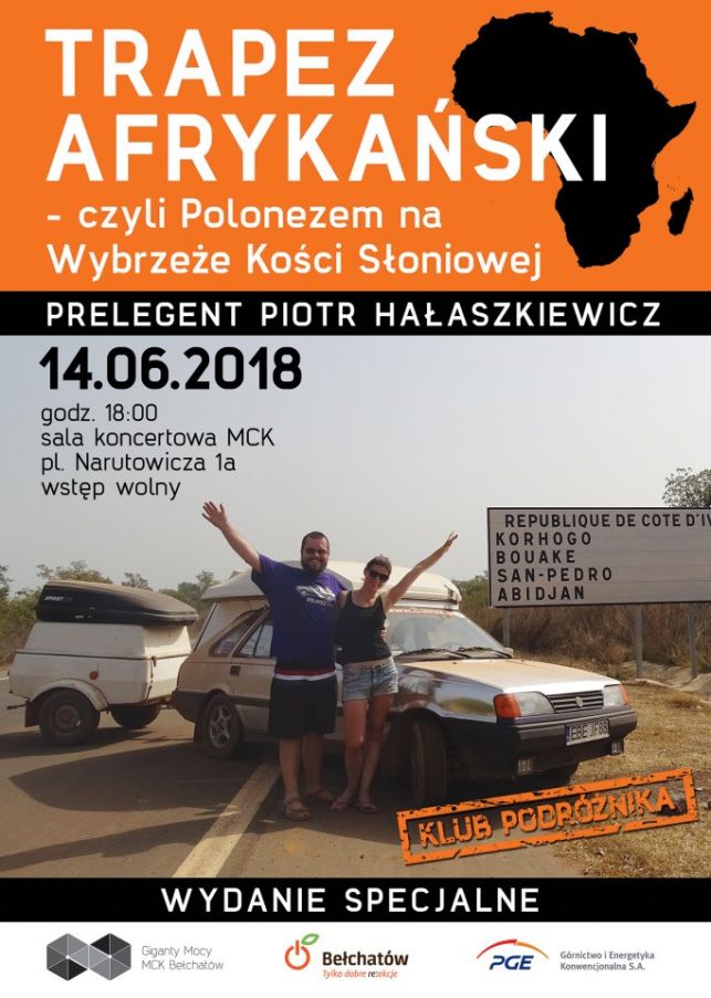 Teoretycznie scenariusz tej wyprawy nie był niczym nadzwyczajnym - oto pewnego dnia, dwoje młodych ludzi rzuca wszystko i na kilka miesięcy udaje się w podróż życia. Takich historii wokół nas coraz więcej, dlatego przestają budzić powszechne zaskoczenie. Ale... No właśnie w przypadku dwojga bełchatowian - Anity i Piotra jest pewne ale. Chodzi bowiem o środek lokomocji jakim podróżnicy wybrali się do Afryki. Oboje przez Czarny Kontynent jechali legendą polskiej motoryzacji - Polonezem. O wspólnej podróży życia opowie jeden z jej uczestników, Piotr Hałaszkiewicz. Podróżnik zdradzi szczegóły wyprawy na Wybrzeże Kości Słoniowej oraz zaprezentuje bogatą fotorelację z podróży.