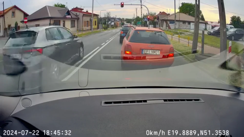 Na nagraniu widać, jak kierowca postanawia ominąć kolumnę pojazdów, która zatrzymała się na czerwonym świetle, przed przejściem dla pieszych.