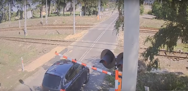 Kierowca seata mimo nadjeżdżającego pociągu - co sugerowała sygnalizacja przed przejazdem - wahał się czy przejechać przez tory czy nie. Ostatecznie zdecydował się na ten pierwszy manewr i... wjechał pod zamykającą się rogatkę.