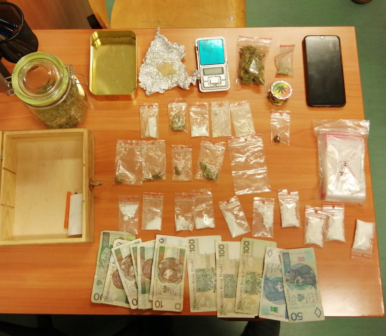 Podczas przeszukania mieszkania mężczyzny policjanci znaleźli kolejne torebki z narkotykami oraz sprzęt służący do ich porcjowania. 33-latek trafił do policyjnego aresztu, gdzie usłyszał zarzut posiadania znacznej ilości środków odurzających, za co grozi do 10 lat pozbawienia wolności.