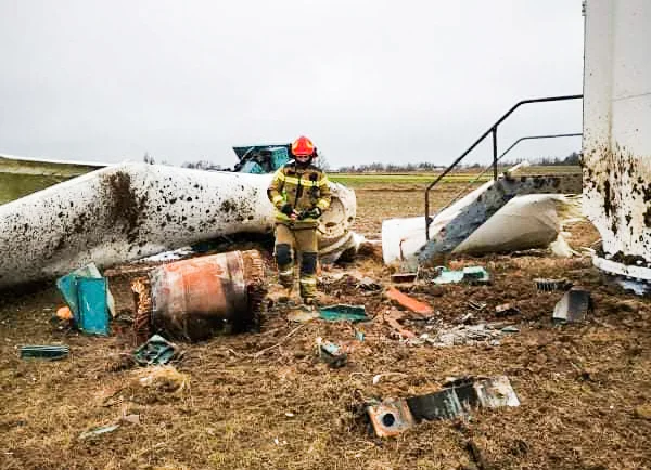 - Wskutek silnego wiatru doszło do zniszczenia turbiny wiatrowej w miejscowości Dmenin. Fragmenty śmigła zostały rozrzucone na obszarze 100 metrów, niektóre z nich wbiły się w ziemię na głębokość około metra. Na części widoczne były ślady okopcenia — informuje Marek Jeziorski z Państwowej Straży Pożarnej w Radomsku.