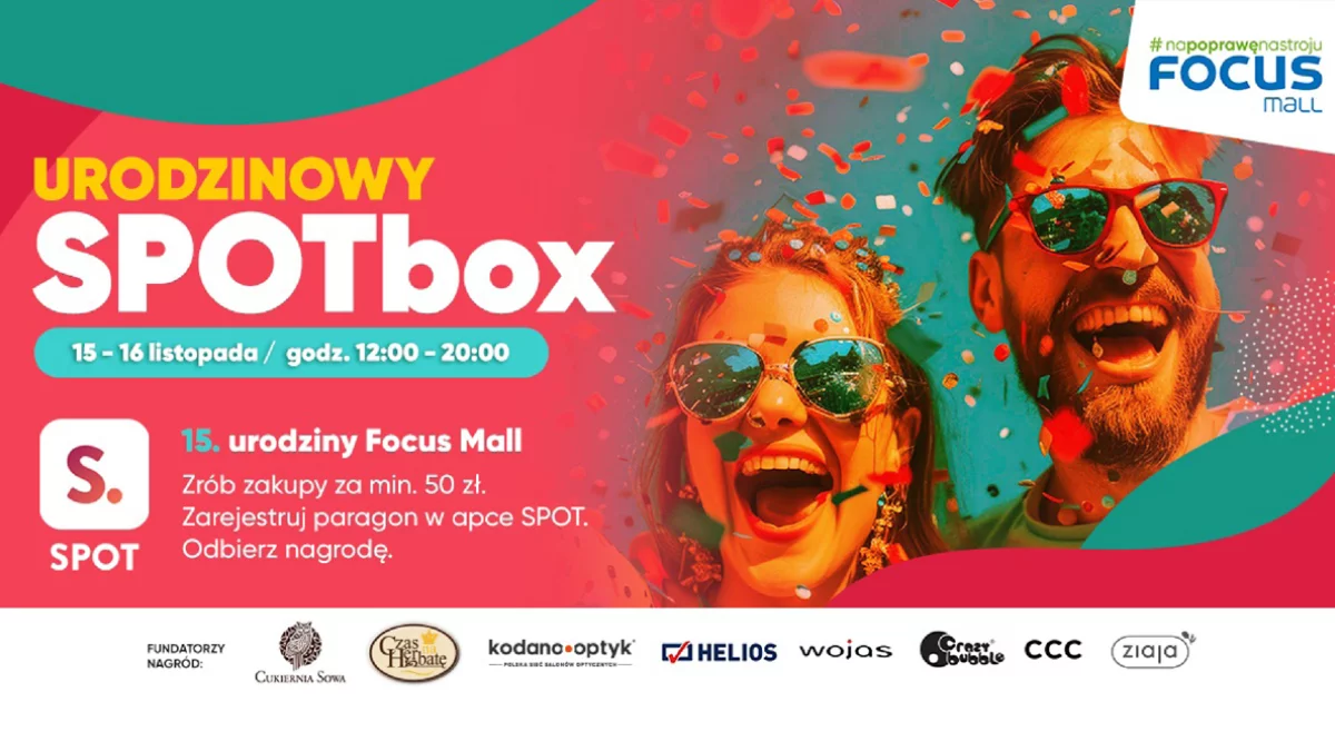 Focus Mall w Piotrkowie Trybunalskim obchodzi swoje 15. urodziny. To okazja do świętowania. Na placu głównym przy H&M w piątek i sobotę w godz. 12:00-20:00 stanie urodzinowa strefa. Na wszystkich klientów w piątek od godziny 12 będzie czekał jubileuszowy tort z Cukierni Sowa. Aby wziąć udział w urodzinowej zabawie trzeba być posiadaczem bezpłatnej aplikacji lojalnościowej SPOT i zrobić w tych dniach zakupy na kwotę minimum 50 zł. Po okazaniu paragonu na specjalnym stoisku będzie można wziąć udział w interaktywnej grze w statki na wielkim dotykowym ekranie i wygrywać wartościowe nagrody. Na zwycięzców czekają m.in. smartwatche, tablety, bezprzewodowe głośniki, słuchawki, gramofony, zestawy kosmetyków, drukarki do zdjęć, maszynki do popcornu oraz prezenty od CCC, Kodano Optyk, Wojas, Ziaja, Helios, Cukierni Sowa, Czas na herbatę oraz Crazy Bubble. Gra jest pełna emocji i rywalizacji, a nawet jeśli nie uda się trafić głównej nagrody, każdy uczestnik otrzymuje nagrodę pocieszenia – 200 punktów w aplikacji SPOT.