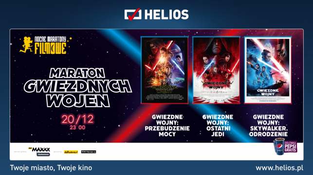 20 grudnia kina Helios zapraszają wszystkich fanów na niepowtarzalną noc z trzema najnowszymi częściami Gwiezdnych Wojen. Na początek GWIEZDNE WOJNY: PRZEBUDZENIE MOCY, w której swoją przygodę rozpoczynają nowi bohaterowie. Następnie GWIEZDNE WOJNY: OSTATNI JEDI, kontynuacja przygód Rey oraz spotkanie z legendarnym Lukiem Skywalkerem. Na koniec premierowo GWIEZDNE WOJNY: SKYWALKER. ODRODZENIE, w którym jasna i ciemna strona mocy stoczą ostateczną batalię.