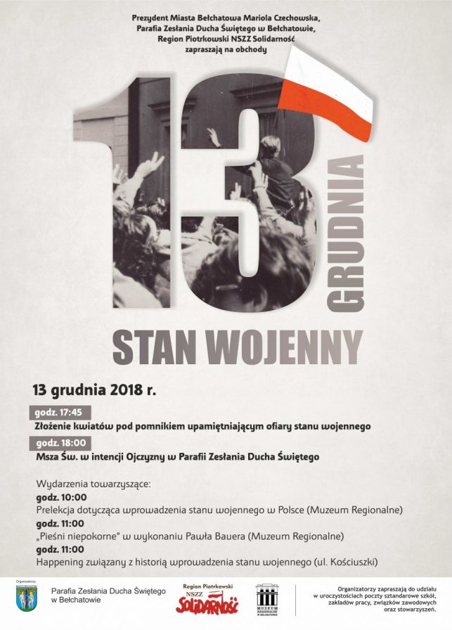 W ramach obchodów 37. rocznicy wprowadzenia w Polsce stanu wojennego w Muzeum Regionalnym o godz. 10:00 odbędzie się prelekcja przybliżająca okoliczności, przyczyny i skutki wprowadzenia tego wyjątkowego stanu w kraju. Tuż po wykładzie, o godz. 11:00, rozpocznie się koncert „Pieśni niepokorne” w wykonaniu bełchatowskiego wokalisty Pawła Bauera. Każdego, kto chciałby dowiedzieć się czegoś więcej na temat historii grudnia 1981 roku, zapraszamy od godz. 11:00 na ulicę Kościuszki, gdzie odbywać się będzie historyczny happening.