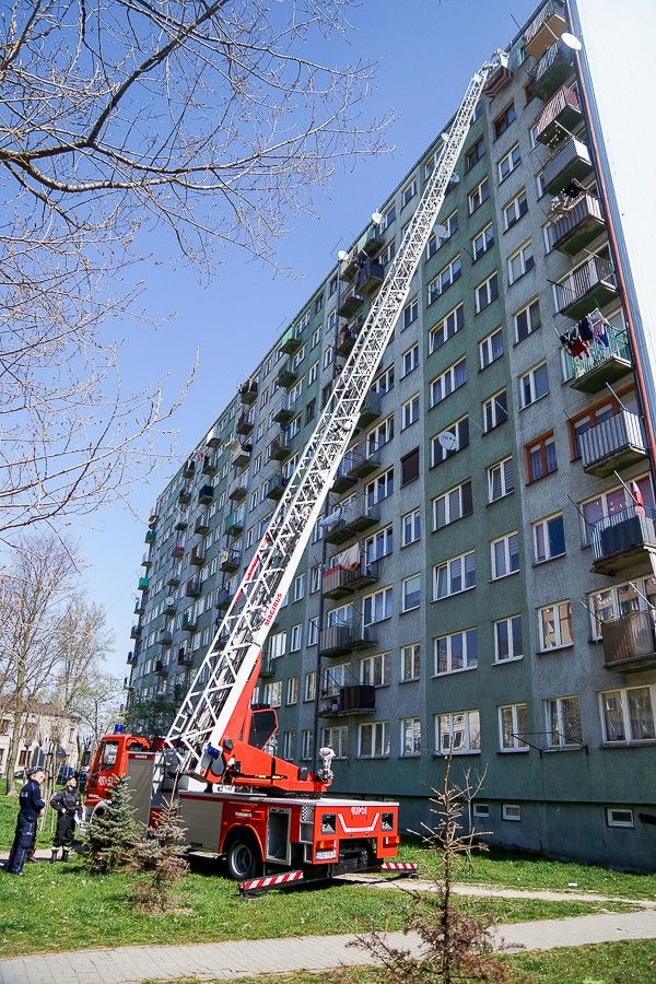 Akcja strażaków na POW. Ratownicy wjechali drabiną na 10. piętro [FOTO]