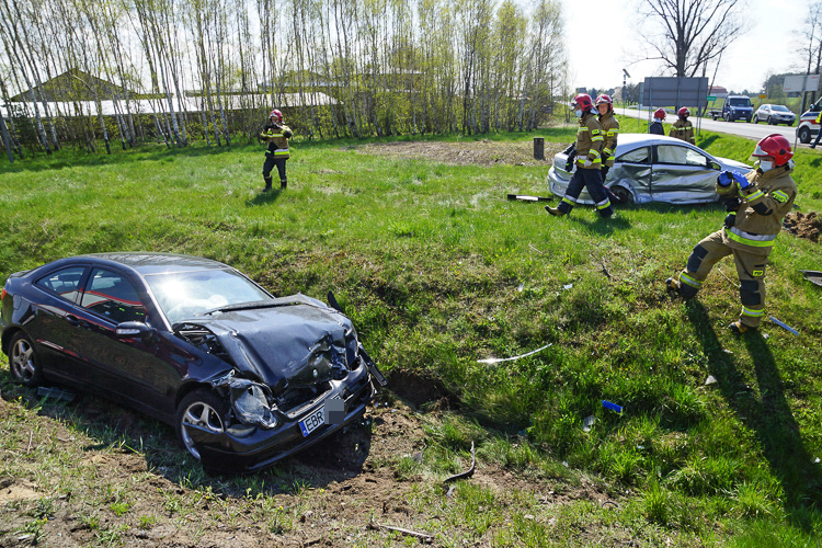 Do wypadku doszło około godziny 10:00 na Drodze Krajowej 74 na wysokości miejscowości Grudna. Wstępne ustalenia z miejsca zdarzenia wskazują, że kierowca opla nie ustąpił pierwszeństwa wjeżdżając na skrzyżowanie, w wyniku czego uderzył w niego rozpędzony mercedes. Impet był na tyle duży, że oba pojazdy wypadły z drogi.