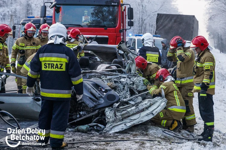 Do tego tragicznego zdarzenia doszło około godziny 14:00, w poniedziałek 13 grudnia na DK-74. Wstępne informacje wskazują, że kierowca osobowego fiata, jadąc od strony Piotrkowa Trybunalskiego do Bełchatowa, zjechał na przeciwległy pas i czołowo zderzył się z ciężarówką. Niestety, impet uderzenia był na tyle duży, że mężczyzna poniósł śmierć na miejscu. Strażacy musięli rozciąć karoserię, aby wydobyć zwłoki z wnętrza pojazdu.