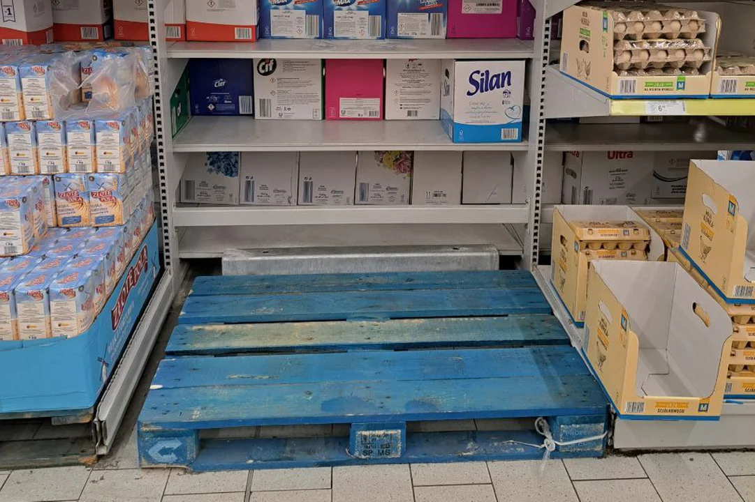 Podobnie jest w markecie Carrefour, tutaj pracownicy codziennie mogą zamawiać po jednej palecie. Taka dostawa przyszła rano, jednak około 13 pozostało po niej jedynie puste miejsce między półkami.