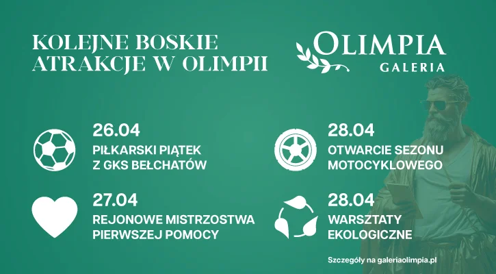 - Niedziela handlowa, 28 kwietnia to w Galerii Olimpia wielkie otwarcie sezonu motocyklowego na parkingu i w pasażu centrum handlowego. Od 13:00 na parkingu będzie czekać szereg atrakcji dla wielbicieli boskich, mechanicznych rumaków – wystawa klasycznych samochodów, plac manewrowy dla motocyklistów, strefa gastronomiczna, atrakcje dla dzieci, nie zabraknie też koncertów lokalnych zespołów Mora i Mantra. Punktem kulminacyjnym około 15:00 będzie wjazd na parking Olimpii kolumny motocyklistów z całego województwa. Spodziewanych jest nawet kilka tysięcy maszyn, które zaparkują na parkingu Galerii Olimpia niczym efektowna armia Zeusa.