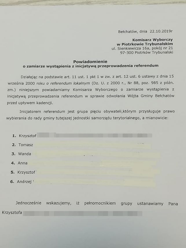 Inicjatywa wyszła spod ręki Krzysztofa Maziarza, który jest pełnomocnikiem 5-cioosobowego gremium. Jak sam zaznacza, chce doprowadzić do odwołania wójta przed końcem obecnej kadencji. Odpowiednie dokumenty wpłynęły już do Komisarza Wyborczego oraz Urzędu Gminy Bełchatów. Teraz inicjatorzy mają czas na zebranie wymaganej ilości podpisów, potrzeba zgody 10% mieszkańców gminy uprawnionych do głosowania (o całkowitej ilości uprawnionych, inicjatorów musi poinformować UG).