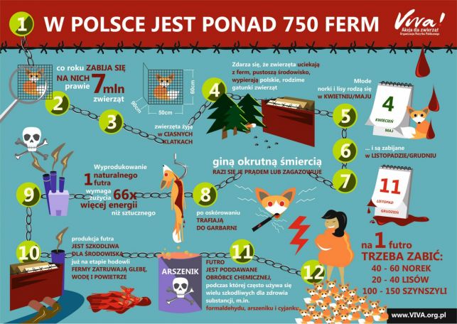 - Zabija się u nas co roku 10 milionów norek amerykańskich i lisów. Hodowcy twierdzą, że zwierzęta na fermach żyją w dobrych warunkach, jednak na nagraniach i zdjęciach ze śledztw Fundacji Viva! widać zwierzęta chore i z objawami stereotypii. Na fermach żyją w ścisku, często nie mają dostępu do wody pitnej. Pod ich klatkami piętrzą się niczym nie odizolowane od podłoża odchody. Te nieprawidłowości potwierdzają raporty Najwyższej Izby Kontroli z 2011 i 2014 r. - informuje Fundacja Viva!