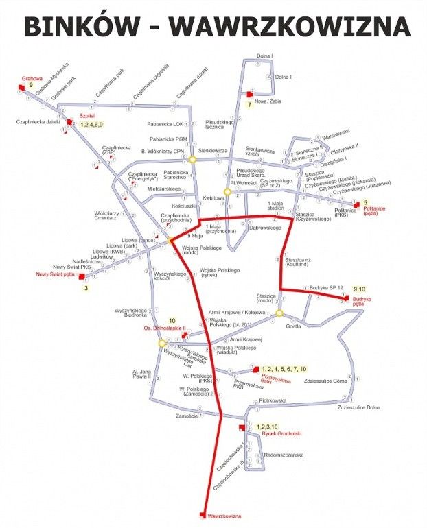 Budryka -> Staszica -> 1 Maja -> 9 Maja -> Wojska Polskiego -> Wawrzkowizna.