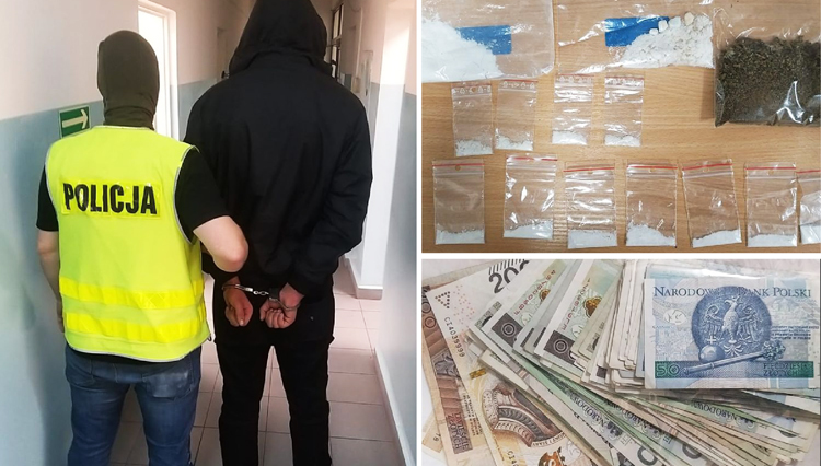 Policjanci znaleźli w jego mieszkaniu marihuanę oraz substancje psychoaktywne. Łącznie przejęto 60 gramów środków odurzających, a także wagę elektroniczną, młynek do mielenia suszu roślinnego oraz gotówkę, którą podejrzewany trzymał w pudełku z narkotykami.