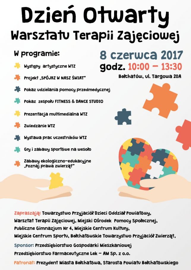Towarzystwo Przyjaciół Dzieci Oddział Powiatowy i Warsztat Terapii Zajęciowej w Bełchatowie zapraszają na „dzień otwarty”. W programie m.in. występy artystyczne WTZ, pokaz pomocy przedmedycznej, gry i zabawy sportowe (na wesoło). Współorganizatorem wydarzenia jest Miejskie Centrum Sportu.