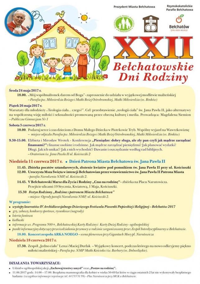 Bełchatowskie Dni Rodziny tradycyjnie towarzyszą obchodom Dnia Patrona Miasta – św. Jana Pawła II. Główne atrakcje zaplanowane są więc na 11 czerwca. Wówczas w ogrodach przy parafii farnej odbędzie się piknik rodzinny, którego zwieńczeniem będzie koncert zespołu Arka Noego na scenie plenerowej przy Gigantach Mocy. Do tego V Bełchatowski Marsz dla Życia i Rodziny, który przejdzie ulicami 19 Stycznia, Kwiatową, 1 Maja, Kościuszki. Zbiórka na pl. Narutowicza zaplanowana jest na godz. 14:45.