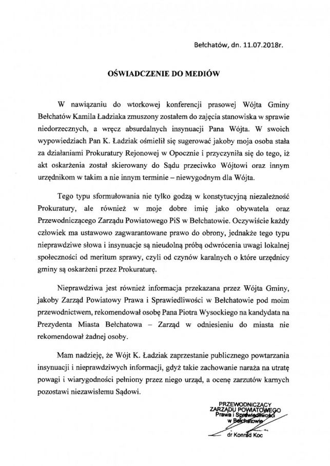 - Tego typu sformułowania nie tylko godzą w konstytucyjną niezależność Prokuratury, ale również w moje dobre imię jako obywatela oraz Przewodniczącego Zarządu Powiatowego PiS w Bełchatowie. Oczywiście każdy człowiek ma ustawowo zagwarantowane prawo do obrony, jednakże tego typu nieprawdziwe słowa i insynuacje są nieudolną próbą odwrócenia uwagi lokalnej społeczności od meritum sprawy, czyli od czynów karalnych o które urzędnicy gminy są oskarżeni przez Prokuraturę.