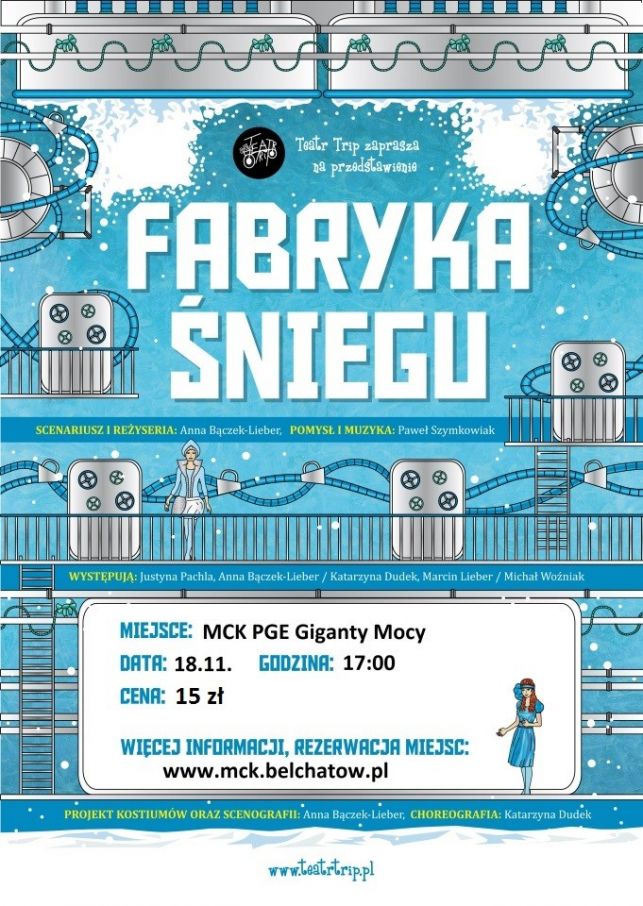 Miejskie Centrum Kultury w Bełchatowie zaprasza na spektakl dla dzieci, pt. „Fabryka Śniegu”, w wykonaniu teatru TRIP, który odbędzie się 18 listopada o godzinie 17:00, w sali teatralno – widowiskowej MCK PGE Giganty Mocy.