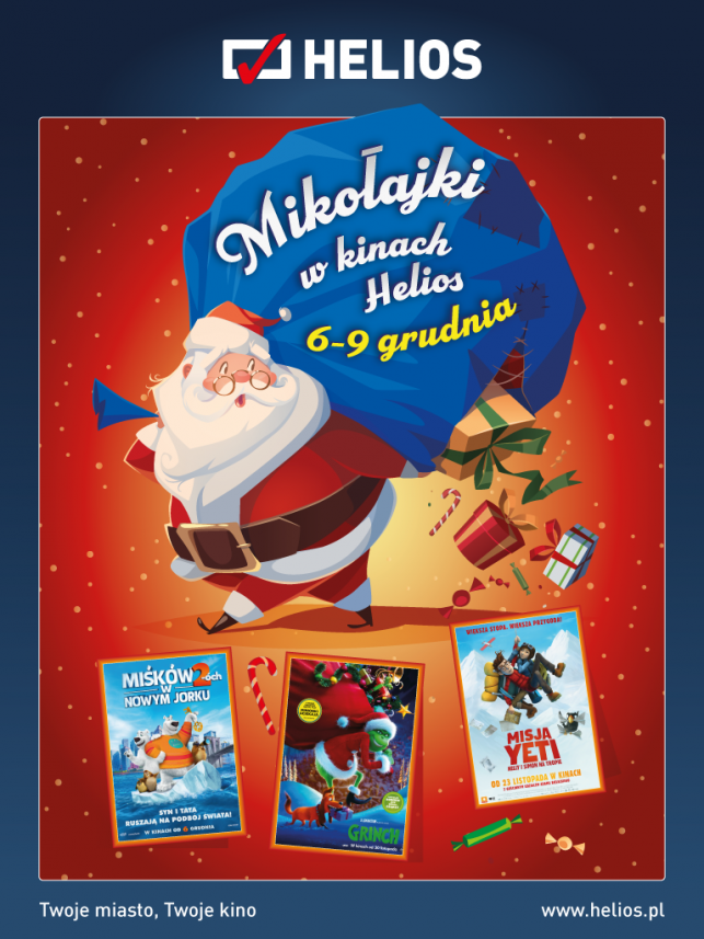 Mikołajki to czas, kiedy kina Helios wypełniają się uśmiechniętymi dziećmi! Pełen emocji niezapomniany Weekend Mikołajkowy zbliża się WIELKIMI krokami! Jak co roku na Widzów bełchatowskiego kina czeka moc atrakcji, najlepsze filmy oraz fantastyczne nagrody! Do zobaczenia na pozytywnych seansach w dniach 6-9 grudnia :)