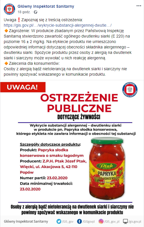 Główny Inspektorat Sanitarny ostrzega, że dwutlenek siarki nie został odnotowany na etykiecie produktu "Papryka słodka konserwowa o smaku łagodnym", a jego spożycie może wywołać reakcję alergenną. Dotyczy to osób, które zmagają się z alergią na dwutlenek siarki i siarczyny. Mowa tu konkretnie o produkcie o numerze partii: 23.02.2020 i takiej samej dacie ważności. Jego producentem jest firma Z.P.H. Ptak Józef Ptak, Więcki.