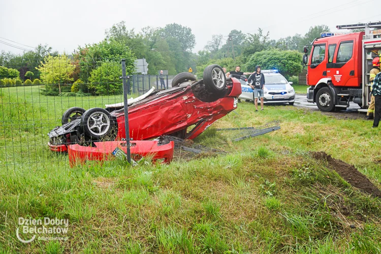 Do wypadku doszło na skrzyżowaniu w Kąciku (gmina Drużbice) około godz. 14. Ze wstępnych ustaleń wynika, że osoba kierująca samochodem osobowym toyota, jadąc od strony Piotrkowa, nie zatrzymała sie na znaku "Stop". W osobówkę uderzyła ciężarówka, która jechała od strony Wadlewa. Siła uderzenia była tak duża, że toyota przeleciała przez ogrodzenie i dachowała.
