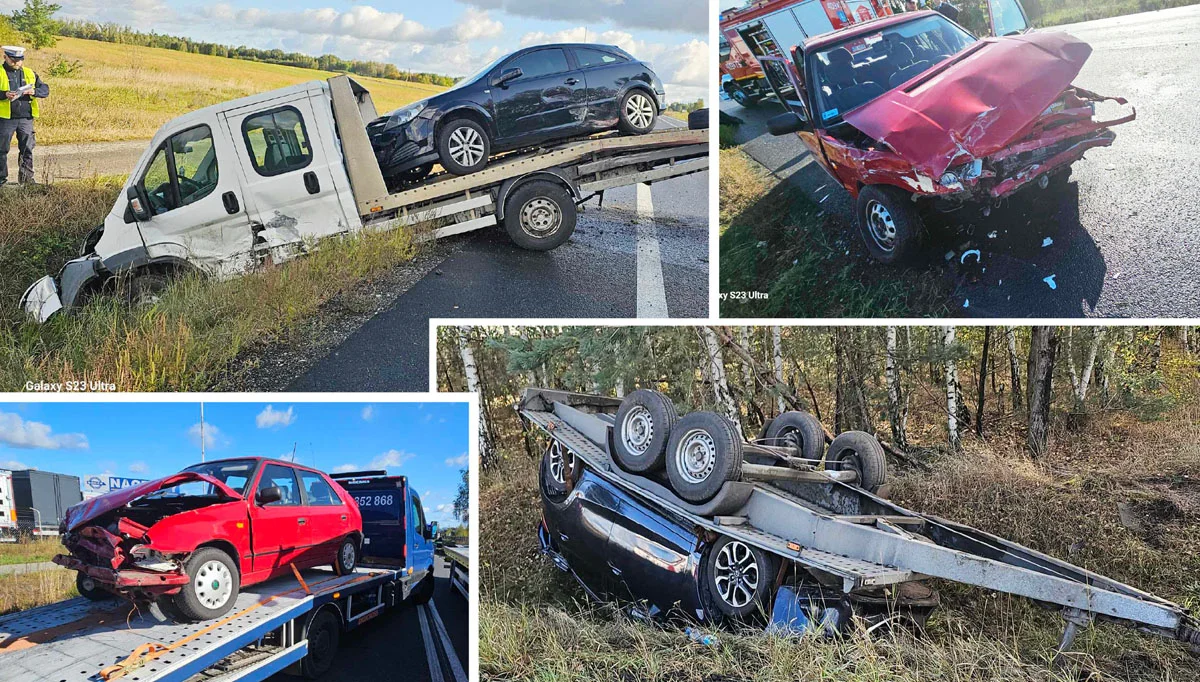 Doszło zderzenia pojazdów. Siła uderzenia sprawiła, że auto poruszające się po DK-74 wpadło do rowu, a przyczepa odłączyła się i wywróciła do góry nogami po drugiej stronie jezdni, wraz ze znajdującym się na niej samochodem.