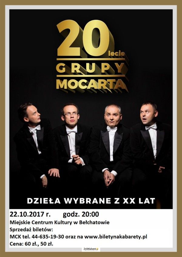 Miejskie Centrum Kultury w Bełchatowie zaprasza na koncert kabaretu Grupa MoCarta, który odbędzie się w dniu 22.10 o godz.20.00, w sali teatralno - widowiskowej MCK PGE Giganty Mocy.