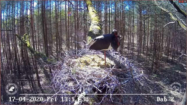 - 7 kwietnia 2020 r. w gnieździe, które nazwiemy na potrzeby projektu „Dąb 2” pojawiła się para bocianów czarnych. Nie wiemy jaka jest historia tych ptaków, bo nie mają obrączek, ale wygląda na to, że ptaki znają się dobrze, znają gniazdo i jego otoczenie. Zapewne jest to para, która gnieździła się w tutaj w roku 2019. Po przylocie bociany już kopulowały, oba ptaki nocowały na gnieździe – podaje Nadleśnictwo Bełchatów