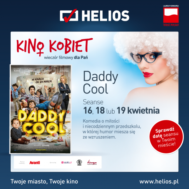 Sieć kin Helios zaprasza na najnowszą odsłonę filmowego cyklu Kino Kobiet. Na Panie czeka moc atrakcji, konkursów oraz przewrotna francuska komedia. „Daddy Cool” to zabawna historia opowiadająca nietypową historię pary, która ma zupełnie inne priorytety w życiu… Aby utrzymać przy sobie marzącą o założeniu rodziny 40-letni Maude, Adrien zakłada domowe przedszkole!