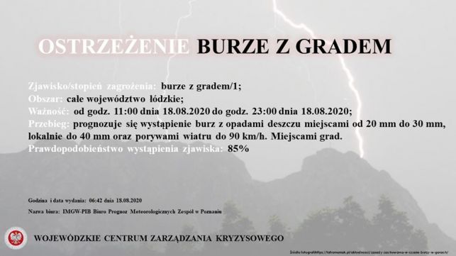 Wtorek, 18 sierpnia to kolejny dzień, w którym – jak wynika z zapowiedzi synoptyków – należy przygotować się na gwałtowne burze. IMGW wydało ostrzeżenie 1 stopnia dla całego województwa łódzkiego, obowiązuje ono w godzinach od 11:00 do 23:00.