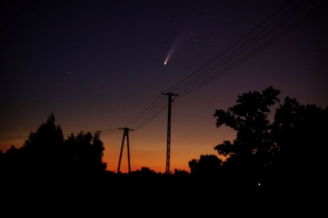 - Kometa jest dość jasna i można wypatrzeć ją gołym okiem, tuż po zachodzie słońca. Widoczna jest przez całą noc początkowo od północnego zachodu, później na północy i nad ranem widoczna na północnym wschodzie. Znajduję się około 8* nad horyzontem, czyli trzeba się wybrać poza miasto i lasy – informuje facebookowy profil Łowcy Burz Łódzkie.