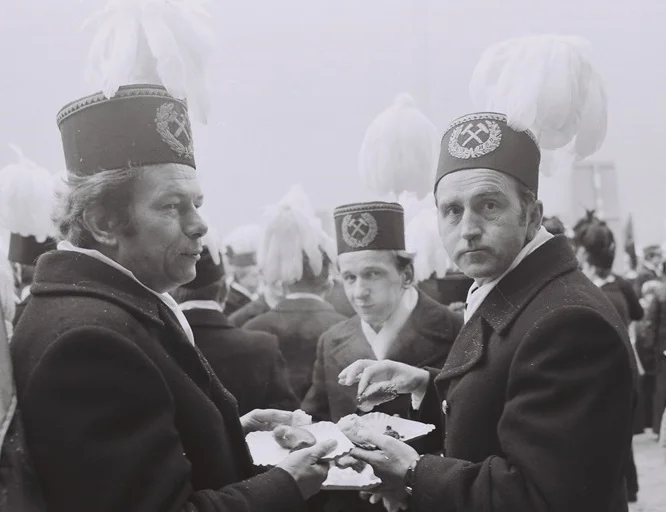 Górnicy podczas pochodów ubrani są w galowe mundury. Różnią się kolorem piór umieszczonych na czapce. Kolory piór mają swoją symbolikę: zielone noszą generalni dyrektorzy, czerwone przynależą orkiestrze górniczej, a biało-czerwone tamburmajorowi. Wielu górników z KWB Bełchatów nosi białe pióra. Dla kogo są one przypisane?