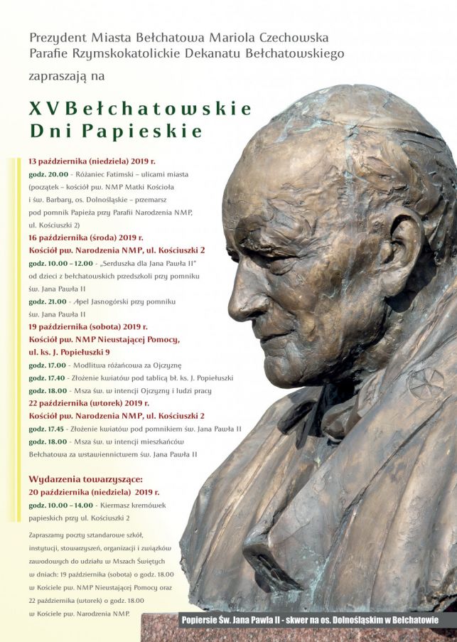 W niedzielę, 13 października Dni Papieskie rozpoczną się o godzinie 20:00 Różańcem Fatimskim. Uczestnicy przejdą ulicami Bełchatowa, startując spod kościoła pw. NMP Matki Kościoła, a kończąc marsz przed pomnikiem św. Jana Pawła II przy parafii pw. Narodzenia NMP. Z kolei, 16 października, czyli w rocznicę wyboru Jana Pawła II na papieża, przedszkolaki spotkają się przy jego pomniku, aby udekorować go własnoręcznie przygotowanymi serduszkami. Wydarzenie to zaplanowane jest w godzinach od 10:00 do 12:00. Natomiast wieczorem, około godziny 21:00 odbędzie się tam Apel Jasnogórski.
