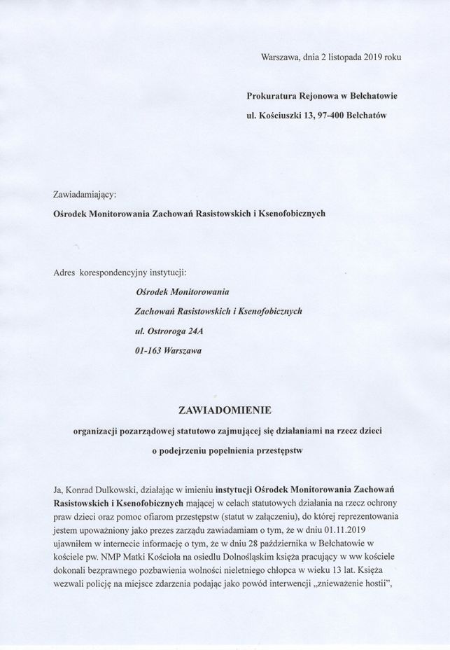 Wiemy więc, że księża z parafii w Bełchatowie nie muszą obawiać się konsekwencji ze strony archidiecezji czy biskupa. Mogą jednak spodziewać się pozwu – wynika z informacji publikowanych przez Ośrodek Monitorowania Zachowań Rasistowskich i Ksenofobicznych. Jej przedstawiciel poinformował nas dzisiaj, że w sobotę 2 listopada do bełchatowskiej prokuratury zostało wysłane zawiadomienie możliwości popełnienia przestępstwa. Główny zarzut dotyczy bezprawnego pozbawienia wolności. Wiemy też, że oskarżeń ze strony OMZRiK jest więcej, nie znamy jednak treści całego dokumentu. Archidiecezja łódzka nie komentuje sprawy pozwu.