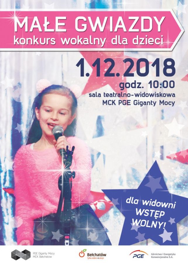 Miejskie Centrum Kultury w Bełchatowie zaprasza do udziału w 12. edycji konkursu wokalnego, pn. „Małe Gwiazdy”, który odbędzie się 1 grudnia o godzinie 10:00, w sali teatralno - widowiskowej MCK PGE Giganty Mocy.
