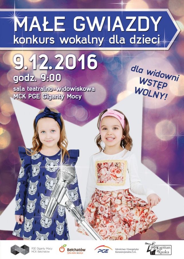 Miejskie Centrum Kultury w Bełchatowie zaprasza na tegoroczną edycję konkursu wokalnego dla najmłodszych, pn. „Małe Gwiazdy”, który odbędzie się 9 grudnia, w sali teatralno – widowiskowej MCK PGE Giganty Mocy.