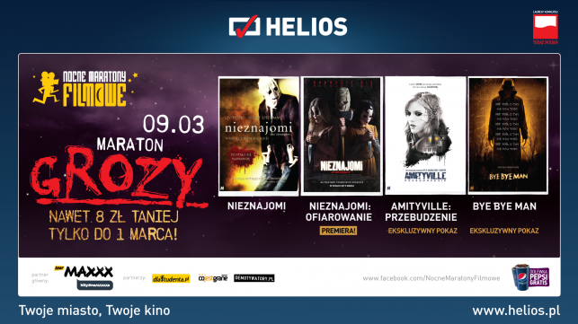 9 marca zapraszamy do kin Helios w całej Polsce na bezsenną noc z filmami, w których groza gra pierwsze skrzypce, a jedynym ich celem jest śmiertelnie nas wystraszyć. Pokażemy aż cztery przerażające horrory, w tym premierę i dwa filmy dostępne włącznie na tym maratonie. Na początek „NIEZNAJOMI” i premierowo „NIEZNAJOMI: OFIAROWANIE”, a dalej ekskluzywne pokazy filmów „AMITYVILLE: PRZEBUDZENIE” i „BYE BYE MAN”.