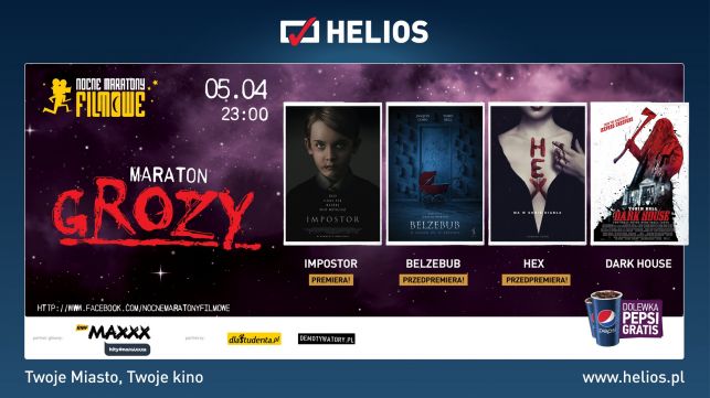 Już 5 kwietnia, specjalnie z myślą o wszystkich kochających się bać, zagramy zestaw filmów, w których groza gra pierwsze skrzypce. W ciągu jednej nocy pokażemy cztery horrory, w tym jeden premierowo i aż dwa to przedpremiery! Opętania, mroczne legendy, nawiedzone domy – to wszystko tylko wstęp do grozy jaką niosą ze sobą te filmy. Na początek długo wyczekiwany, premierowy IMPOSTOR. Następnie przedpremierowo – BELZEBUB i po krótkiej przerwie inspirowany mitologią ludową - HEX. Na zakończenie mroczny i tajemniczy DARK HOUSE.