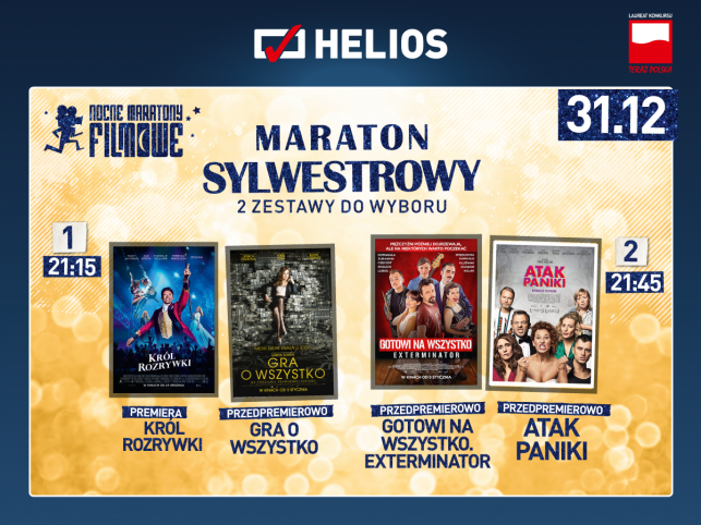 Ogólnopolska sieć kin Helios zaprasza wszystkich Widzów pragnących przywitać Nowy Rok u boku gwiazd na wystrzałowy Maraton Sylwestrowy. Do wyboru będą aż dwa zestawy znakomitych, przedpremierowych filmów!