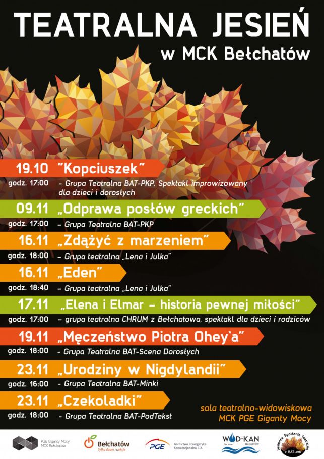 Teatralna jesień rozpocznie się już 19 października i trwać będzie do końca listopada. Jakie spektakle czekają na Was tej jesieni? Podczas tegorocznej, 25 już edycji Jesiennych Spotkań Teatralnych z BAT-em, na deskach sali teatralno-widowiskowej MCK PGE Giganty Mocy, swoje spektakle zaprezentują wszystkie z sześciu grup teatralnych, działających w Miejskim Centrum Kultury.