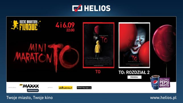 Tym razem aż dwa terminy do wyboru: 4 i 6 września kina Helios zapraszają na wyjątkową ucztę filmową, podczas której ekranami naszych kin zawładną adaptacje popularnej powieści Stephena Kinga! Na początek „TO”. Grupa dzieciaków odkrywa tajemnicę zagadkowych zaginięć i stawia czoła swoim największym koszmarom. Po krótkiej przerwie, premierowe „TO: ROZDZIAŁ 2”. Po 27 latach dorośli już bohaterowie powracają do Derry, aby ostatecznie rozprawić się z upiornym klaunem zwanym Pennywise.