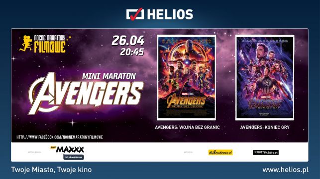 W piątek 26 kwietnia kina Helios zapraszają na mini maraton z całą plejadą superbohaterów! Na początek przypomnimy „Avengers: Wojna bez granic”. Bohaterowie ze świata Marvel Studios stają do walki z potężnym przeciwnikiem. Niestety bezwzględnemu Thanosowi udaje się zrealizować swój niecny plan. Zaraz po krótkiej przerwie, premierowy Avengers: Koniec gry. Po przegranej bitwie Avengersi zrobią wszystko co w ich mocy, aby pokonać Thanosa i ocalić życie we wszechświecie. Na szczęście przybywa nieoczekiwana pomoc…
