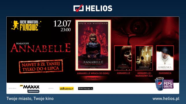 Już 12 lipca kina Helios zapraszają na noc horrorów z demoniczną lalką Annabelle. W ciągu tej nocy zagramy cztery filmy, które mają za zadanie śmiertelnie Was przestraszyć! Na początek ANNABELLE, historia inspirowana sprawą badaną przez małżeństwo Warrenów. Następnie trzymający w napięciu ANNABELLE: NARODZINY ZŁA. Po krótkiej przerwie premierowo - ANNABELLE WRACA DO DOMU. Upiorna lalka powraca, budząc pozostałe przerażające demony. Na koniec dla najwytrwalszych ZAKONNICA z piekła rodem!