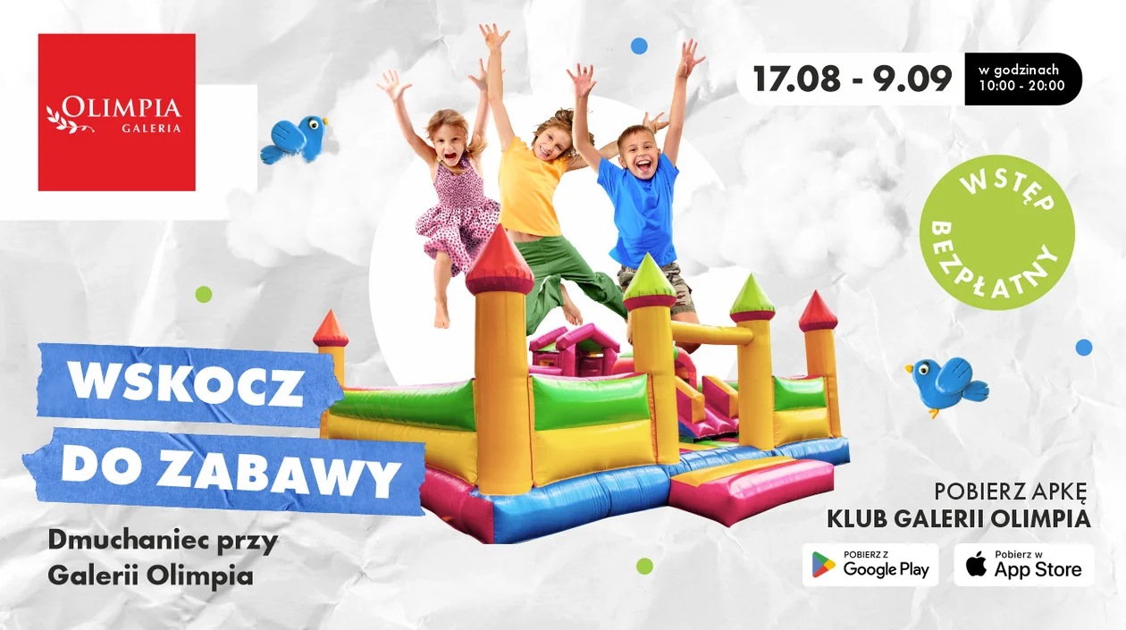 Przy Galerii Olimpia ustawiona została atrakcja, którą zdecydowanie uwielbiają maluchy. Dzieci już od czwartku, 17 sierpnia, mogą bawić się na dmuchańcu całkowicie za darmo, wystarczy tylko zdobyć wejściówkę. Galeria Olimpia przewidziała na to dwie możliwości.