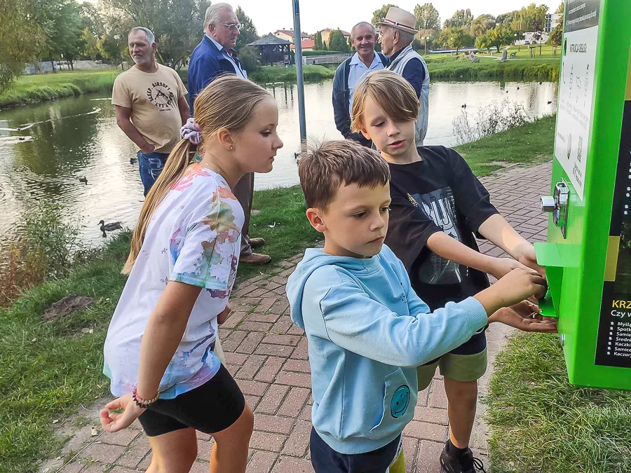 W związku z tym w parku przy Dworku Olszewskich w Bełchatowie stanęło nietypowe urządzenie. Ptasi Bufet, nazywany również kaczkomatem, wygląda jak automat z kulkami dla dzieci. Zamiast zabawek wypełniony jest jednak zdrową karmą, którą bez obaw można podać ptakom.