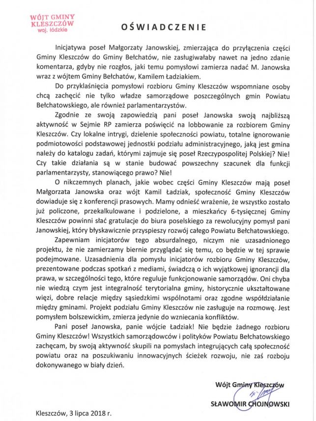 Ostre oświadczenie ze strony Kleszczowa: ''Pani poseł Janowska, panie wójcie Ładziak! Nie będzie żadnego rozbioru Gminy Kleszczów!'' | 1 / 21 / 2 | 2 / 22 / 2